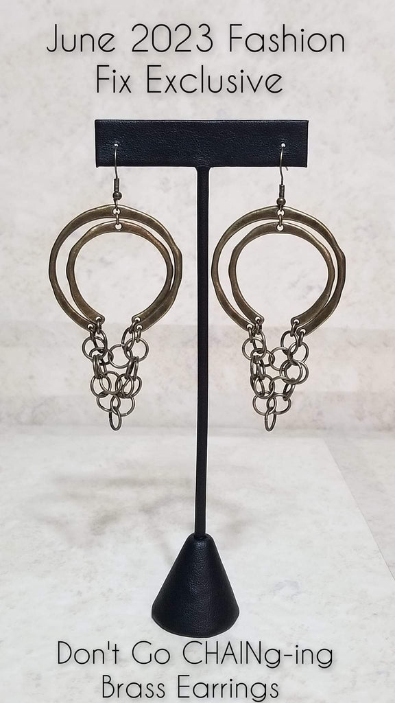 Two hammered, oblong, brass hoops in varying sizes layer on top of one another for some whimsical movement. Cutting each hoop into half-circle frames, gritty brass hoops interlock and layer together to form a chained collection that boldly drapes down the ear for an industrial statement. Features a fishhook setting.
